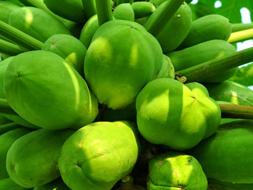 番木瓜(學(xué)名:Carica papayaL.)是番木瓜科、番木瓜屬植物。常綠軟木質(zhì)小喬木,高達(dá)可達(dá)10米,具乳汁;葉大,聚生于莖頂端,近盾形,葉柄中空,花單性或兩性,植株有雄株,雄花:排列成圓錐花序,下垂;花無梗;萼片基部連合;花冠乳黃色,冠管細(xì)管狀,雌花:單生或由數(shù)朵排列成傘房花序,著生葉腋內(nèi),花冠裂片分離,